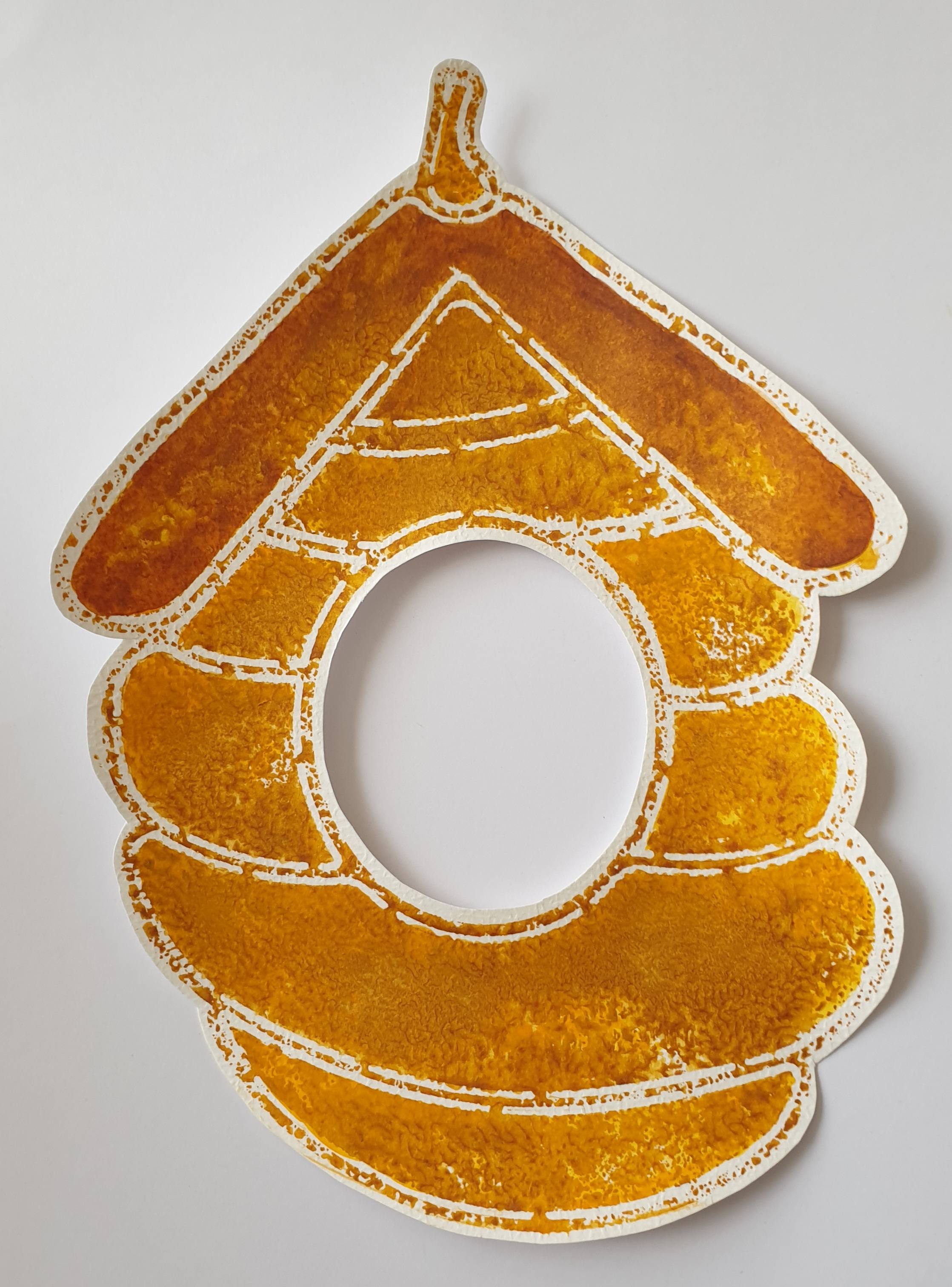 De mask van de bijenkorf heb ik op een stuk aquarel papier gelegd en vervolgens heb ik een spray inkt gebruikt.
